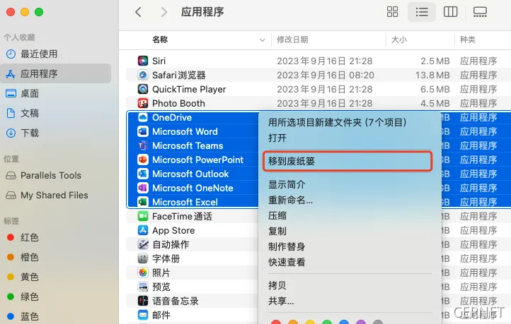 然后右键选择“移到垃圾篓”选项,移除Office