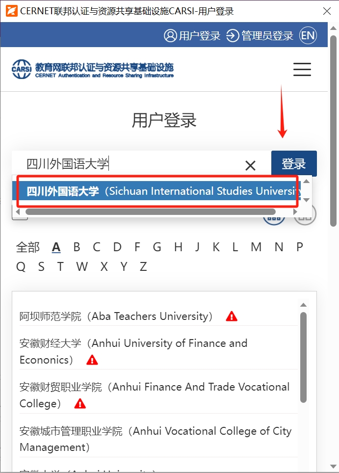 ④选择完CARSI后,系统将自动跳转至CARSI登录页面,在方框中填入所在学校名称,点击“登录”按钮;(如遇到证书已过期提示,请点击继续登录即可)